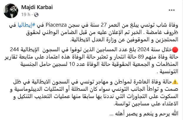 وقال الكرباعي، في تدوينة نشرها على حسابه بمنصة التواصل فيسبوك، إنّ "شابًا تونسيًا يبلغ من العمر 27 سنة توفي في سجن Piacenza في إيطاليا في ظروف غامضة"، مشيرًا إلى أنّه تم الإعلان عن الخبر من قبل الضامن الوطني لحقوق المحتجزين والموقوفين عن وزارة العدل الإيطالية.