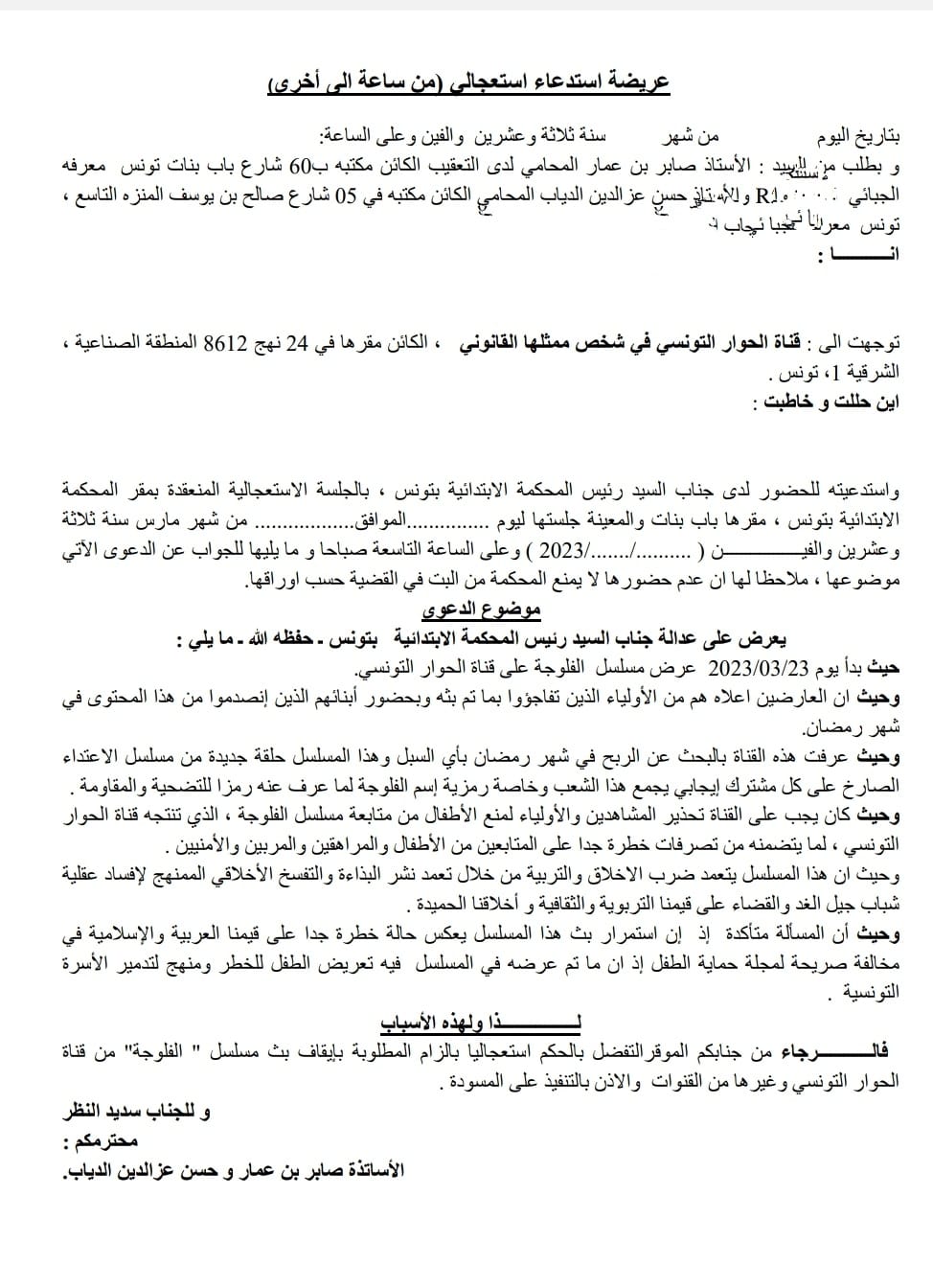 قرر المحاميان صابر بن عمار وحسن عز الدين دياب، تقديم دعوى إستعجالية، أمام أنظار المحكمة الاستعجالية بتونس اليوم الجمعة 24 مارس 2023، للمطالبة بإيقاف بث مسلسل ''فلوجة'' على قناة الحوار التونسي.