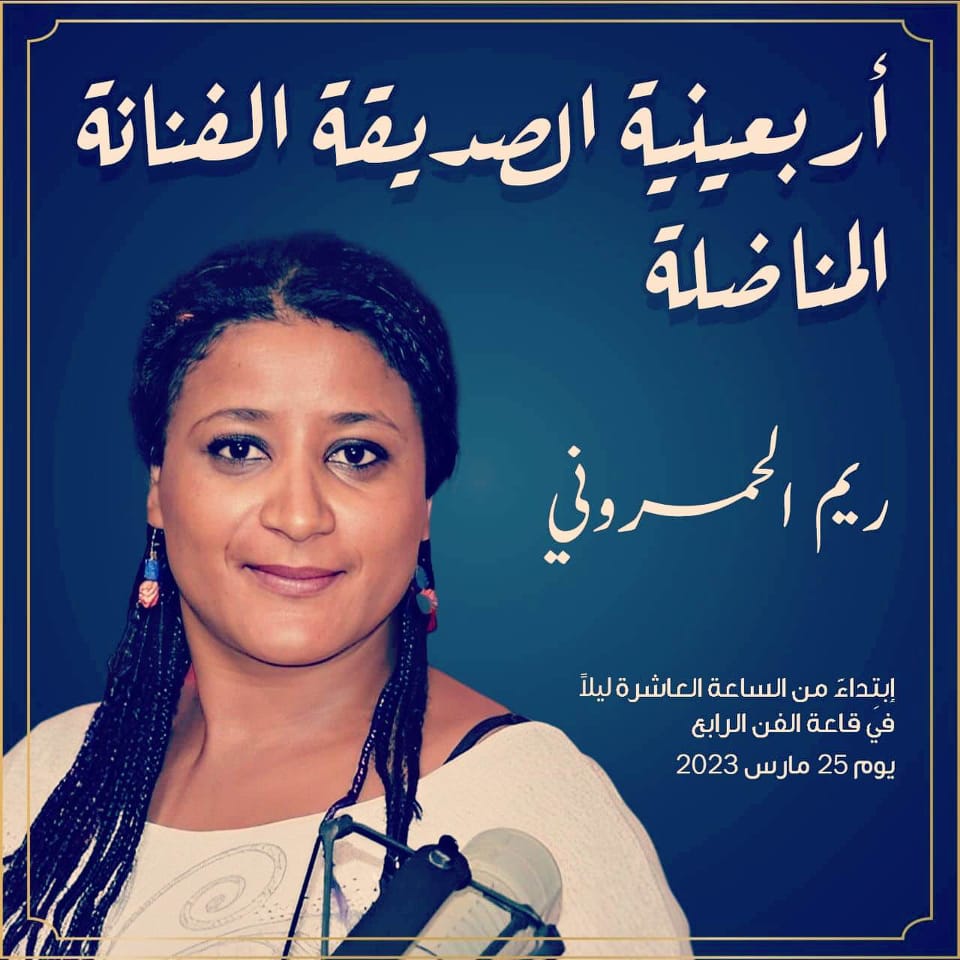 تنتظم أربعينية الممثلة الراحلة ريم الحمروني ،يوم السبت 25 مارس 2023 ،بقاعة الفن الرابع بالعاصمة انطلاقا من الساعة العاشرة ليلا.