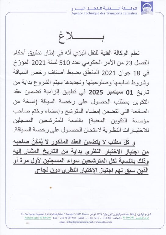 أعلنت الوكالة الفنية للنقل البرّي، أنّه سيتمّ الشروع بداية من 1 سبتمبر القادم، في تطبيق إلزامية تضمين عقد التكوين بمطلب الحصول على رخصة السياقة (نسخة من الصفحة التي تتضمن إمضاء المترشح وإمضاء وختم صاحب مؤسّسة التكوين المعنية)، بالنسبة للمترشحين المسجلين للاختبارات النظرية لامتحان الحصول على رخصة السياقة.