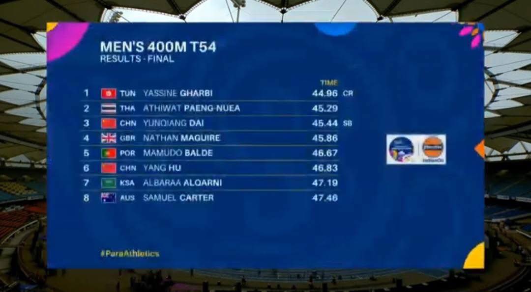 في إنجاز رياضي بارالمبي مشرّف، توّج البطل التونسي ياسين الغربي اليوم الثلاثاء 30 سبتمبر 2025 بالميدالية الذهبية في سباق 400 متر كراسي متحرك (فئة T54) ضمن بطولة العالم لألعاب القوى البارالمبية الجارية في نيودلهي الهند.