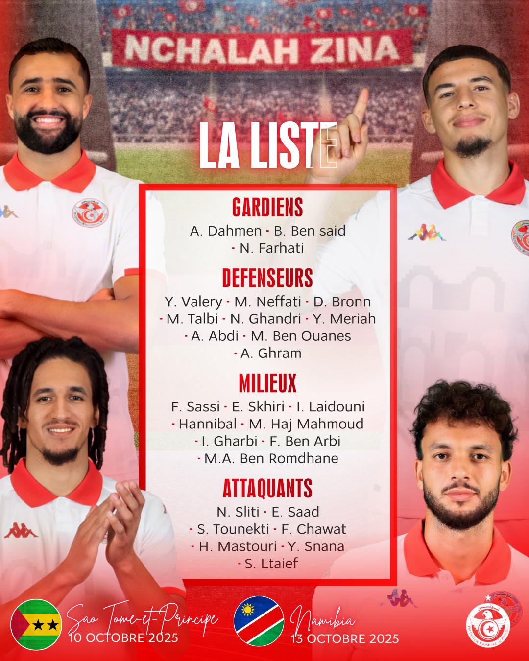 أعلن مدرب المنتخب التونسي، سامي الطرابسلي، اليوم الخميس 2 أكتوبر 2025، عن القائمة الرسمية للنسور إستعدادا لمبارتي ساوتومي و ناميبيا