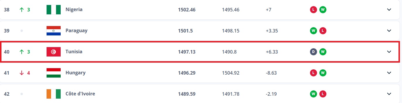 تقدم المنتخب التونسي لكرة القدم، في ترتيب الاتحاد الدولي لكرة القدم "الفيفا"، الصادر اليوم الأربعاء 19 نوفمبر 2025، بثلاثة مراتب، ليصبح في المركز 40 عالميًا بعد أن كان يحتل المرتبة 43 في التصنيف السابق في 17 أكتوبر 2025.