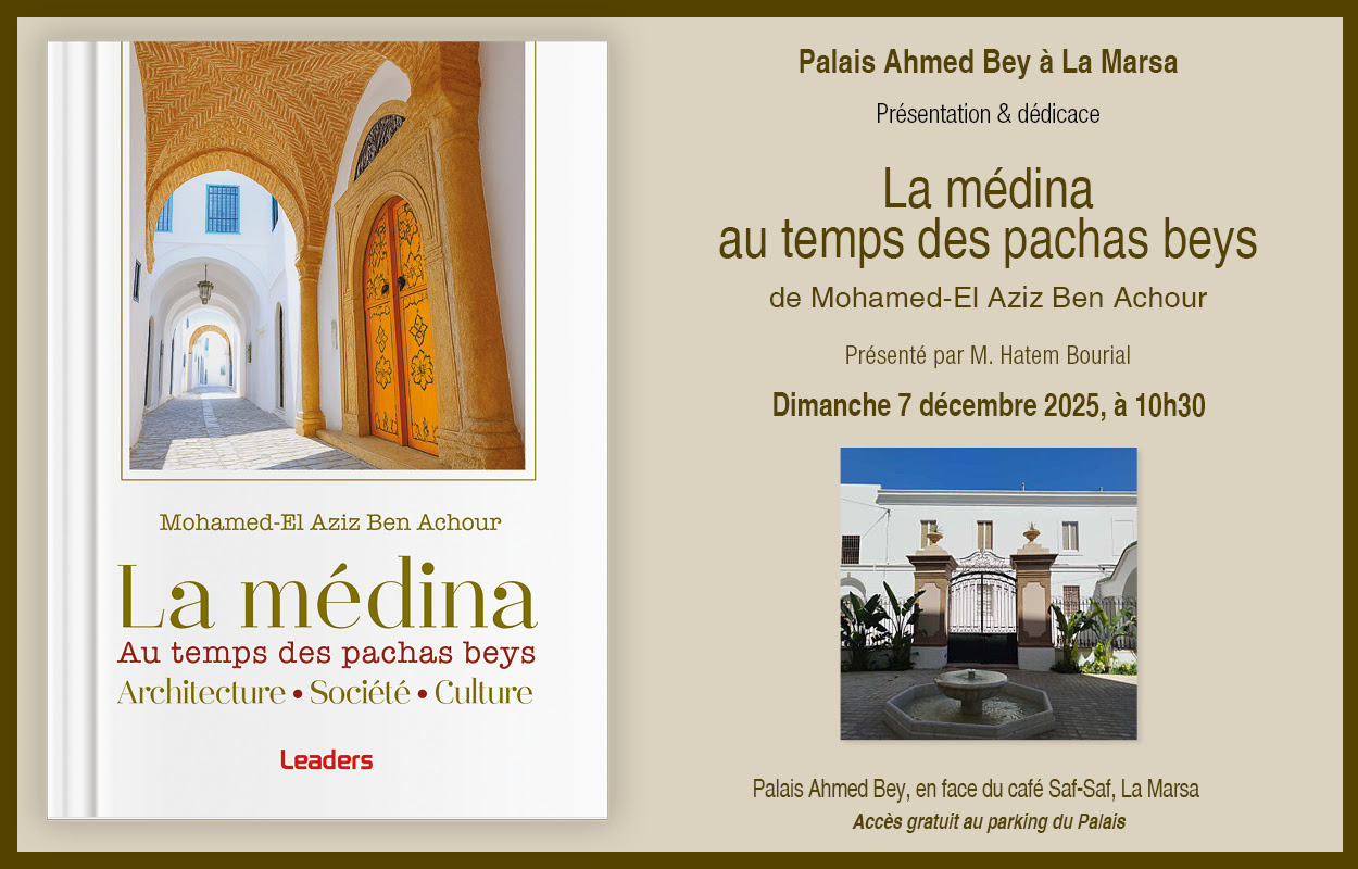 ينظّم قصر أحمد باي بالمرسى صباح يوم الأحد 7 ديسمبر 2025، حفل تقديم الكتاب الجديد للأستاذ الدكتور محمد العزيز ابن عاشور بعنوان "المدينة في زمن الباشا بايات".
