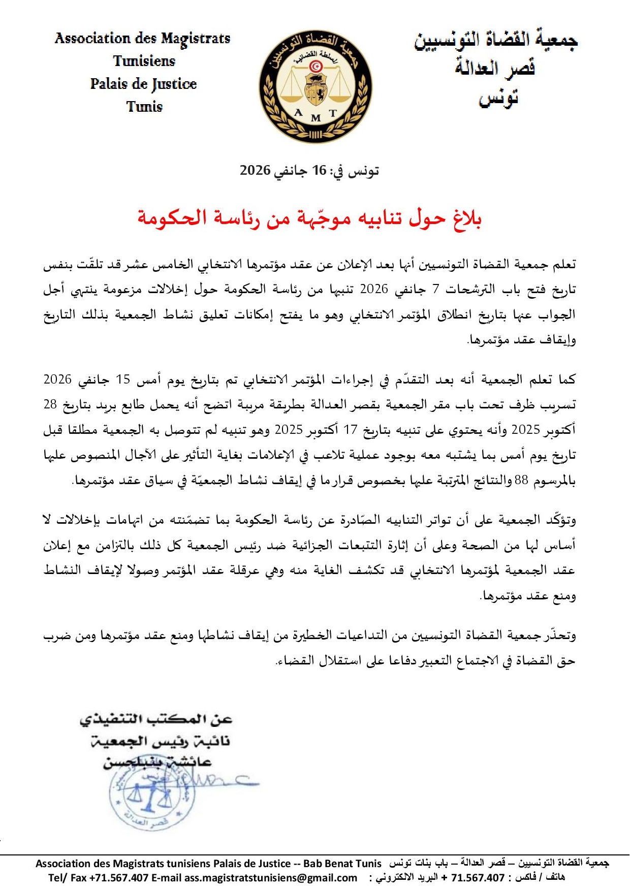 أعلنت جمعية القضاة التونسيين، اليوم الجمعة 16 جانفي 2026، أنّها تلقّت عدة تنبيهات من رئاسة الحكومة بالتزامن مع التحضير لمؤتمرها الانتخابي الخامس عشر.