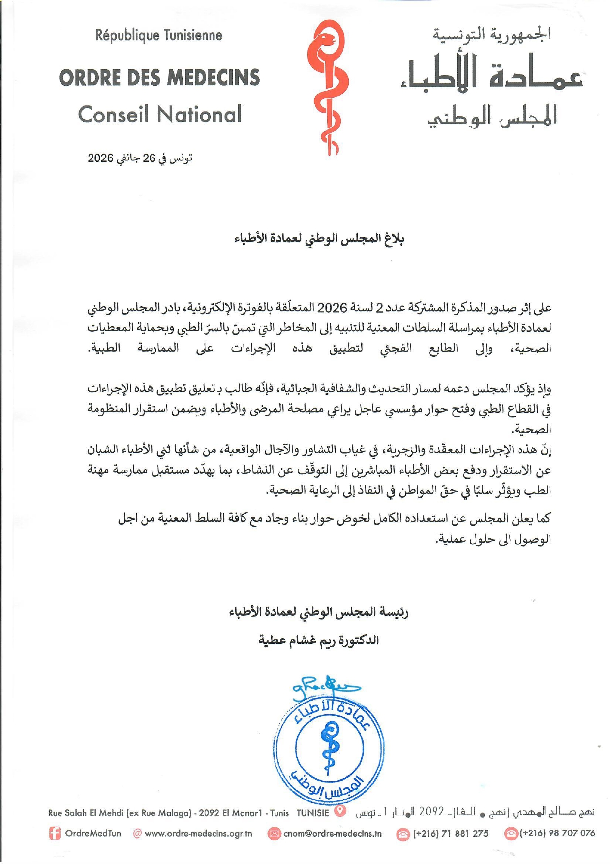 وجدّدت عمادة الأطباء استعدادها الكامل لخوض حوار بنّاء وجادّ مع مختلف السلط المعنية، بهدف التوصّل إلى حلول عملية ومتوازنة تحقّق الإصلاح دون المساس بحقوق المرضى والأطباء.