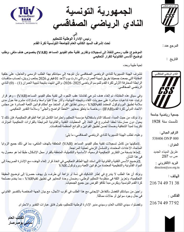 وجّه النادي الرياضي الصفاقسي، اليوم الاثنين 2 فيفري 2026، مراسلة رسمية إلى الإدارة الوطنية للتحكيم، طالب فيها بالاطلاع على تسجيلات وتقارير تقنية الفار المتعلقة بهدفه الملغى خلال مباراة الأمس ضد شبيبة العمران على أرضية ملعب الشادلي زويتن، والتي انتهت بفوز الفريق المحلي 1-0.