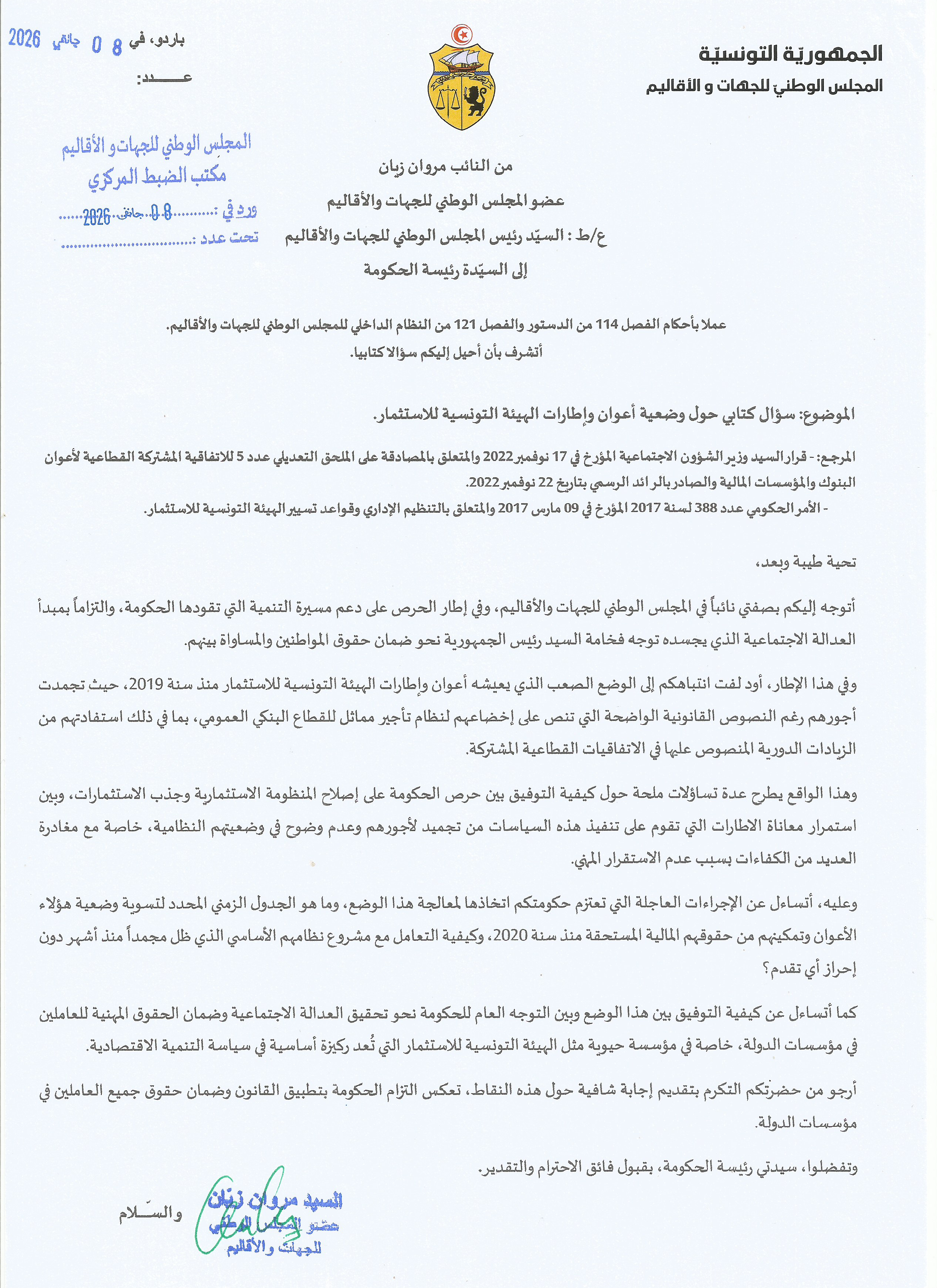 وجّه النائب بالمجلس الوطني للجهات والأقاليم، مروان زيان، سؤالاً كتابياً إلى رئيسة الحكومة، أكد فيه الوضعية المهنية "الحرجة" التي يعيشها أعوان وإطارات الهيئة التونسية للاستثمار، إحدى الركائز الأساسية لدفع عجلة التنمية الاقتصادية في البلاد.