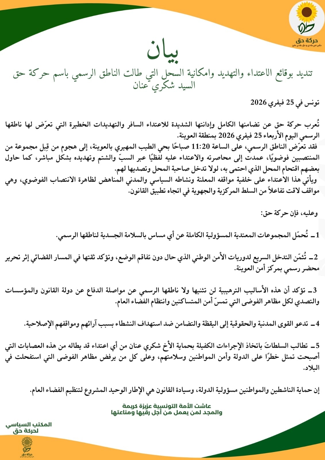 أعلنت حركة حق تعرّض ناطقها الرسمي شكري عنان إلى اعتداء بمنطقة العوينة بالعاصمة.