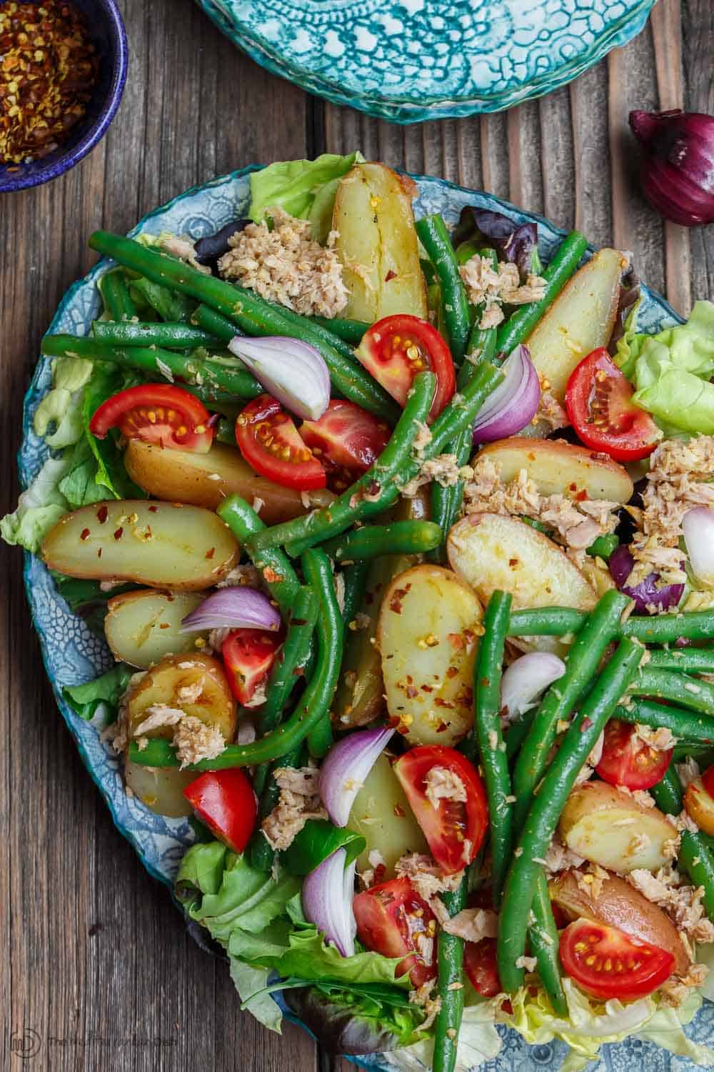 - صب خليط الزيت فوق السلاطة وحركهم في بعضهم, زينها بالتن والعظم وصحة وبالشفاء