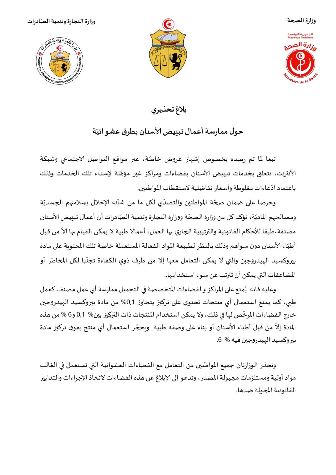 حذّرت وزارتا الصحة والتجارة وتنمية الصادرات المواطنين من التعامل مع الفضاءات العشوائية التي تقدّم خدمات تبييض الأسنان، مشيرتين إلى أنّ هذه الأماكن تعتمد غالبًا مواد أولية ومستلزمات مجهولة المصدر، وهو ما قد يعرّض سلامة الحرفاء إلى مخاطر صحية.