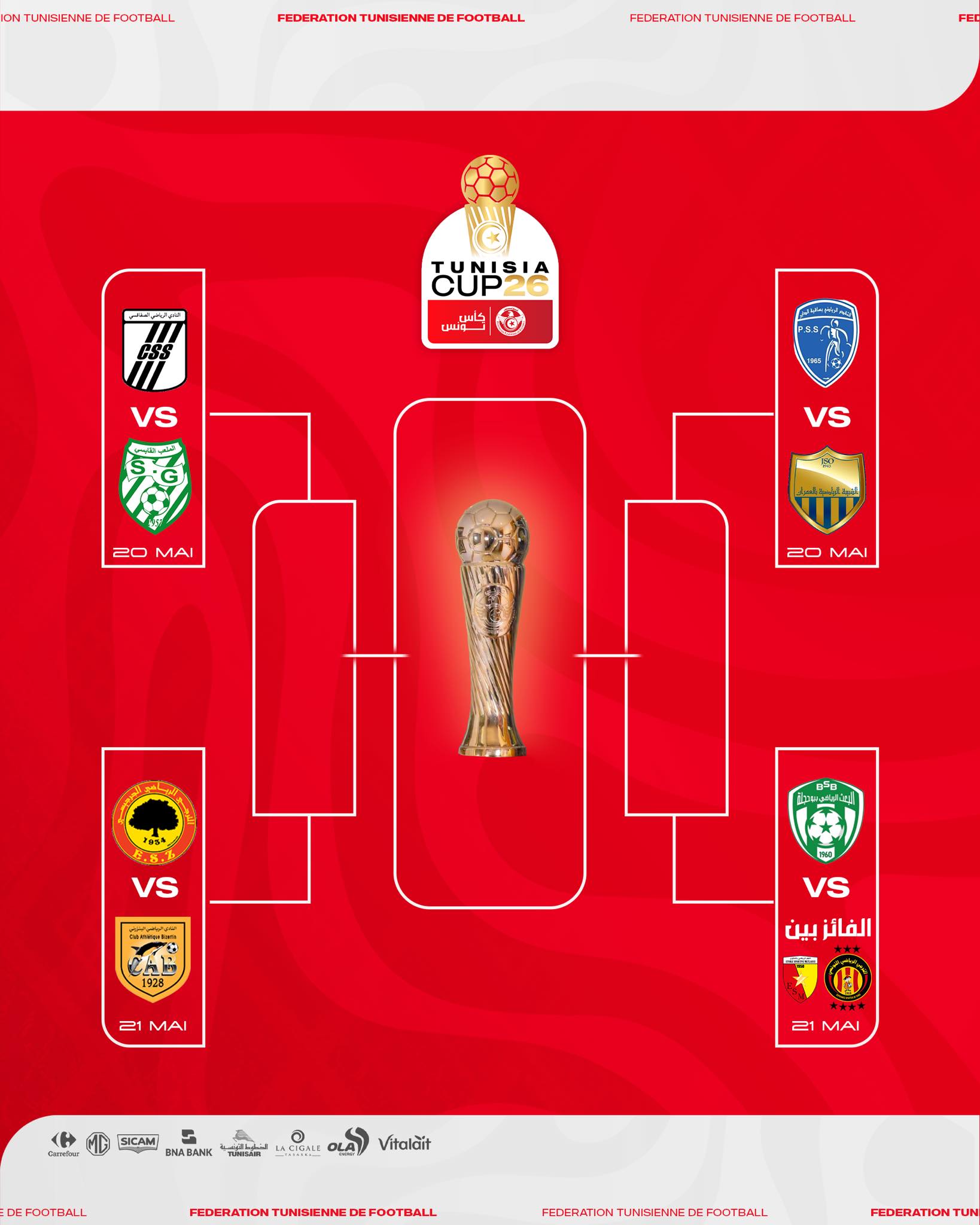 ويلتقي الصاعد من مباراة تقدم ساقية الداير وشبيبة العمران ضد الصاعد من مواجهة بعث بوحجة والفائز من لقاء نجم المتلوي والترجي.