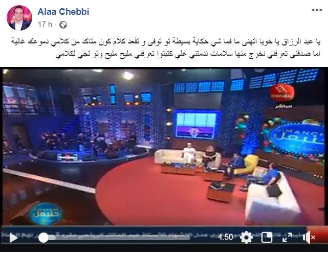 علق الإعلامي علاء الشابي على بكاء شقيقه عبد الرزاق الشابي خلال تأثره وبكائه على المباشر في برنامجه ''ديمنش حنبعل'' خلال حديثه عن وضعه الصحي.