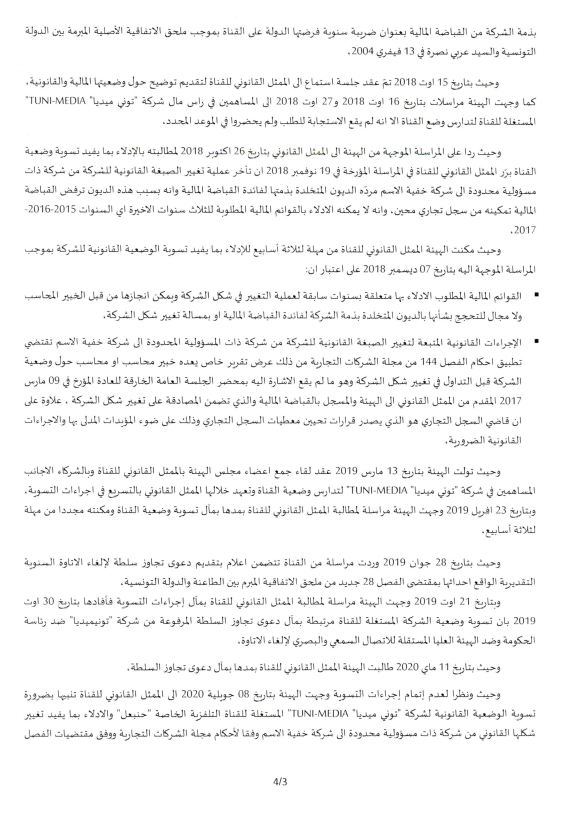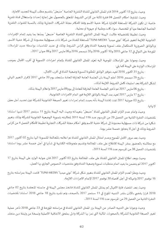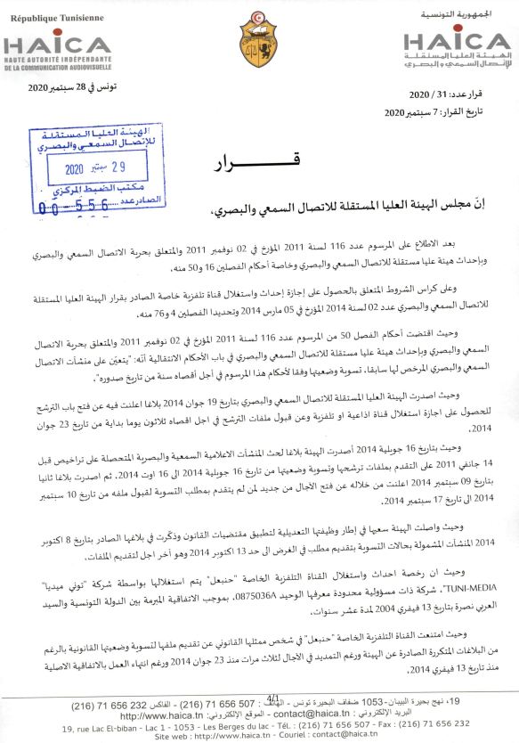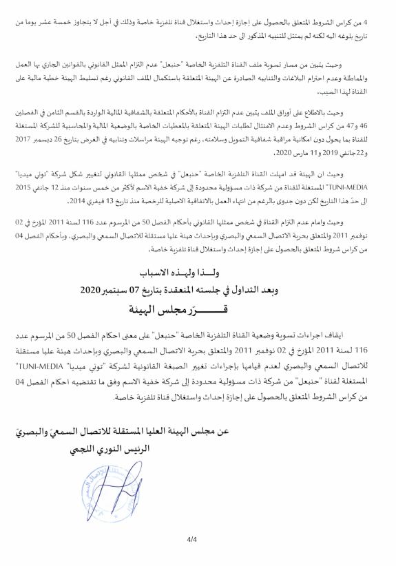 قرر مجلس الهيئة العليا المستقلة للاتصال السمعي والبصري، في جلسته المنعقدة بتاريخ 7 سبتمبر 2020، ايقاف إجراءات تسوية وضعية القناة التلفزية الخاصة "حنبعل" لعدم قيامها بإجراءات تغيير الصبغة القانونية للشركة المستغلة للقناة من شركة ذات مسؤولية محدودة إلى شركة خفية الاسم، وفق ما تقتضيه أحكام كراس الشروط المتعلق بالحصول على إجازة إحداث واستغلال قناة تلفزية خاصة.