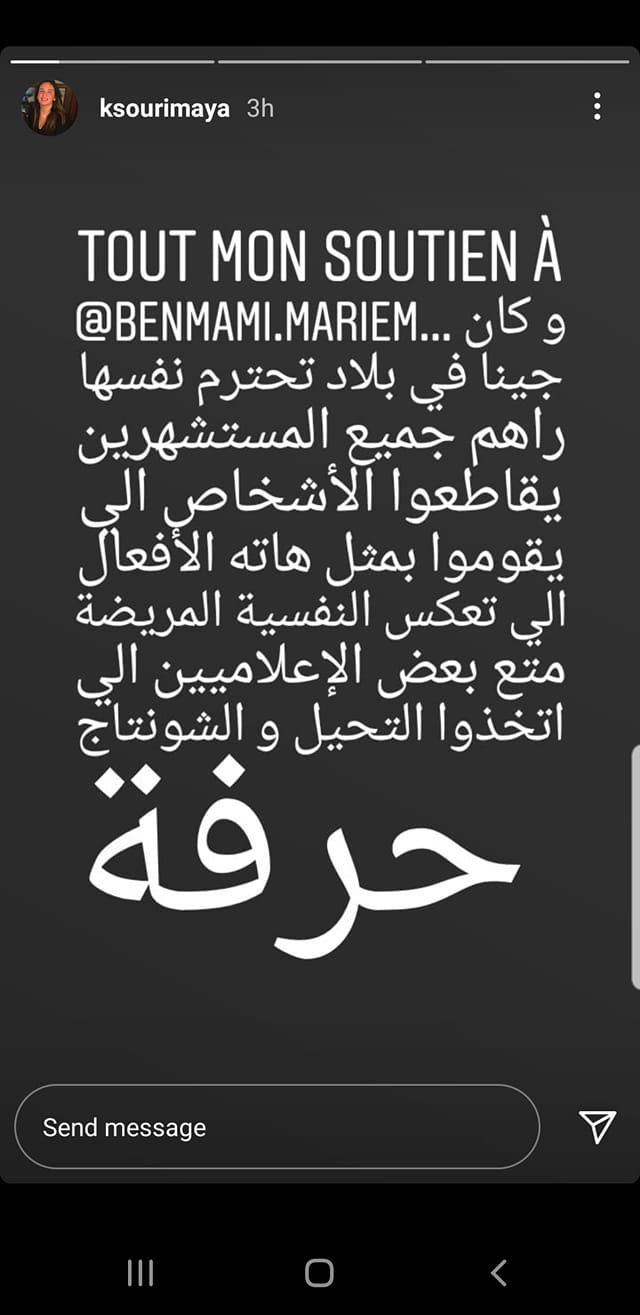 نشرت المحامية مايا القصوري تدوينة عبر خاصية الستوري على موقع التواصل الاجتماعي "انستغرام" تتضامن فيها مع الممثلة مريم بن مامي.