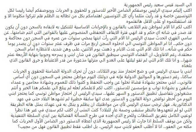توجهت والدة الإعلامي وصاحب قناة الحوار التونسي سامي الفهري بنداء إلى رئيس الجمهورية قيس سعيد عبر تدوينة على موقع التواصل الاجتماعي فايسبوك.
