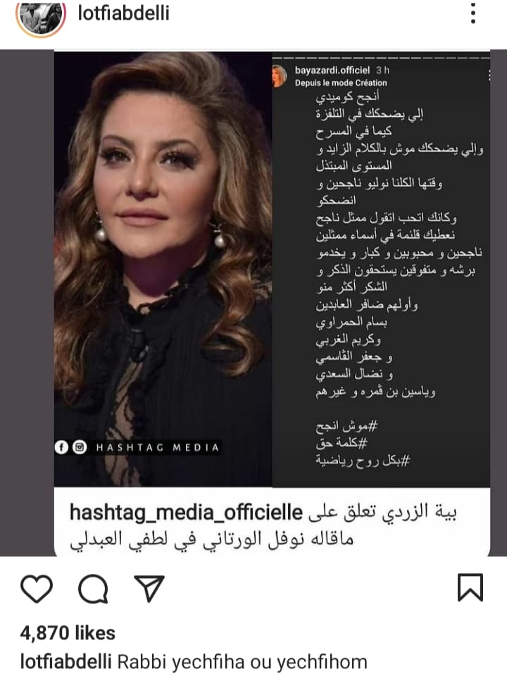 ومن جهته رد الممثل الكوميدي و المنشط لطفي العبدلي من خلال نشر تدوينة بية الزردي على حسابه بموقع التواصل الاجتماعي "انستغرام" و علق عليها "ربي يشفيها و يشفيهم".