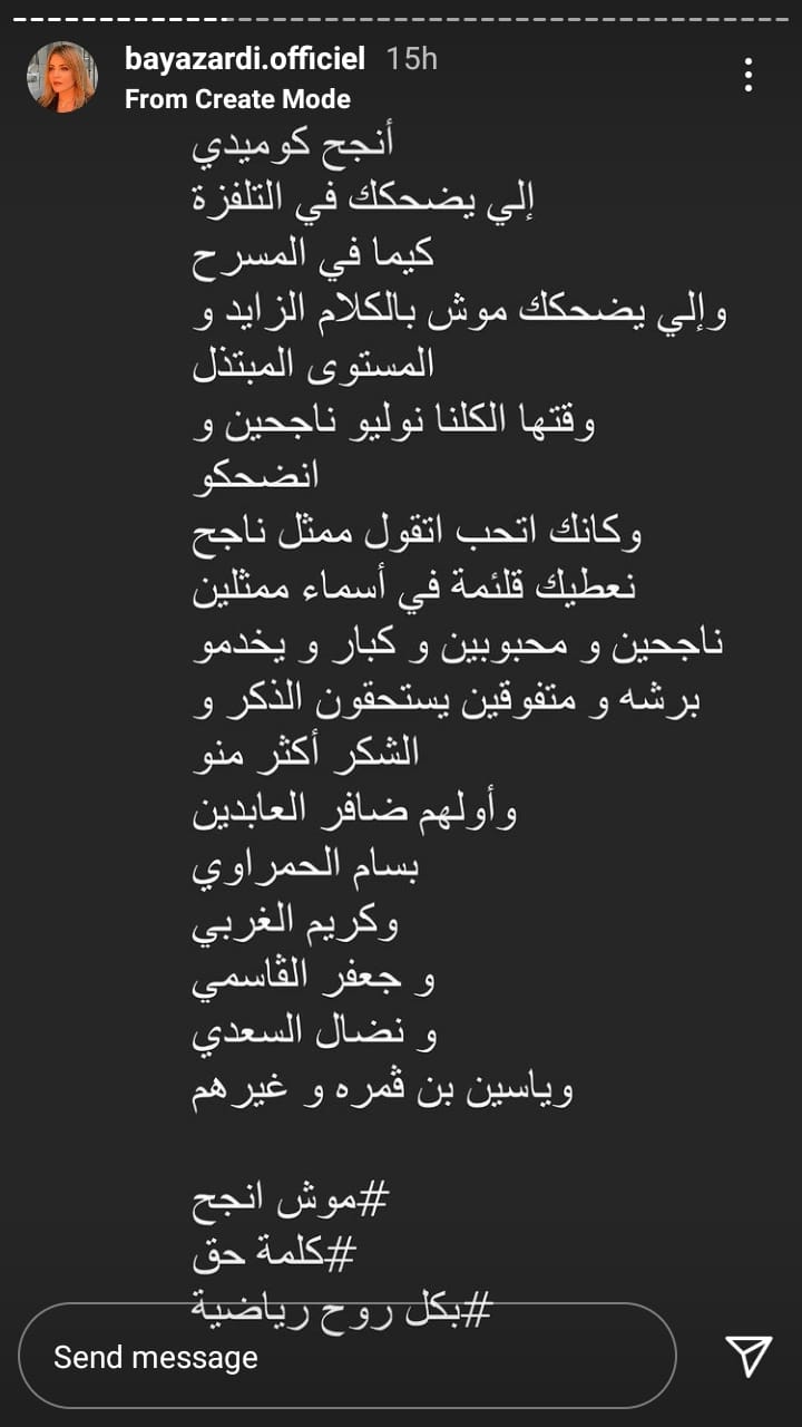 وقالت بية الزردي في تدوينة على خاصية الستوري "انستغرام" "انجح كوميدي الى يضحك في التلفزة كيما في المسرح والى يضحك موش بالكلام الزايد و المستوى المبتذل وقتها الكلنا نوليو ناجحين و نضحكو وكانك تحب تقول ممثل ناجح نعطيك قائمة من أسماء ممثلين ناجحين و محبوبين و كبار و يخدمو برشا و متفوقين يستحقون الذكر و الشكر أكثر منو و أولهم ظافر العابدين و بسام الحمراوي و كريم الغربلي و جعفر القاسمي و نضال السعدي وياسين بن قمرة غيرهم.