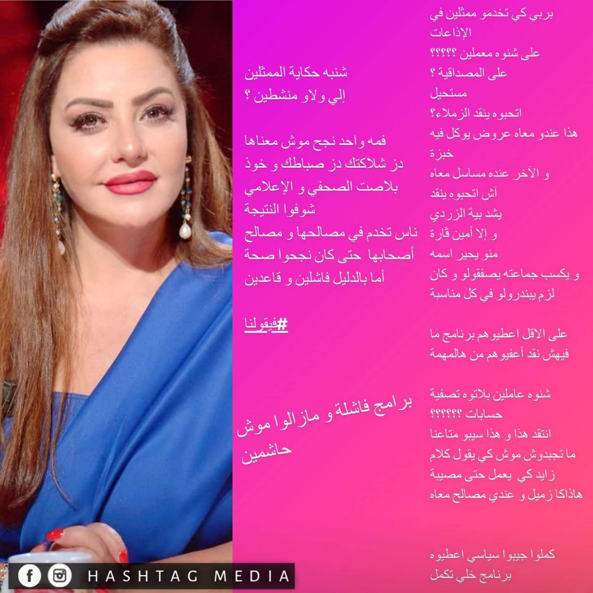 و قالت بية 'بربي كيف تخدموا ممثلين في الاذاعات ... على شنوة معملين ..مستحيل اتحبوه ينقذ الزملاء' و تابعت' عاملين بلاتوه تصفية حسابات ..انتقد هذا و هذا سيبوا متاعنا '.