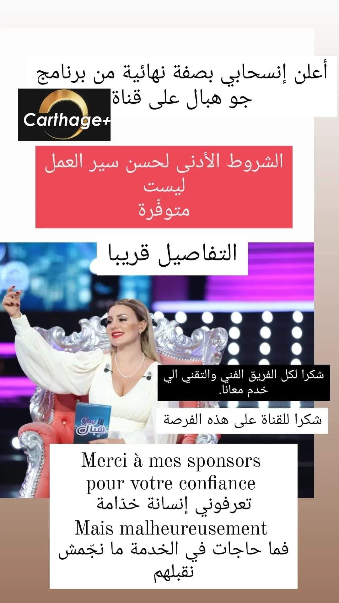 و أعلنت الفنانة منال عمارة ،عن إنسحابها من تقديم برنامج "جو هبال" الذي على قناة قرطاج + في سهرية كل سبت .