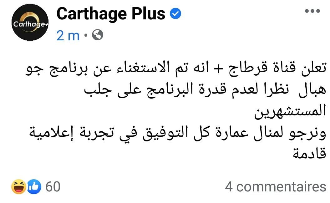 كشفت قناة قرطاج +،يوم الجمعة الفارط ، أن إيقاف برنامج 'جو هبال ' للفنانة الاستعراضية منال عمارة، بسبب عجزها على جلب المستشهرين عكس ما كشفته هذه الأخيرة.