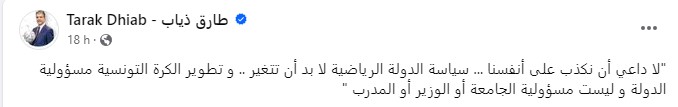 بدوره ، قال المحلل الرياضي ووزير الرياضة السابق طارق ذياب، في تدوينة على صفحته بفيسبوك: "لا داعي أن نكذب على أنفسنا.. سياسة الدولة الرياضية لا بد أن تتغير وتطوير الكرة التونسية مسؤولية الدولة وليست مسؤولية الجامعة أو الوزير أو المدرب "، حسب تقديره.