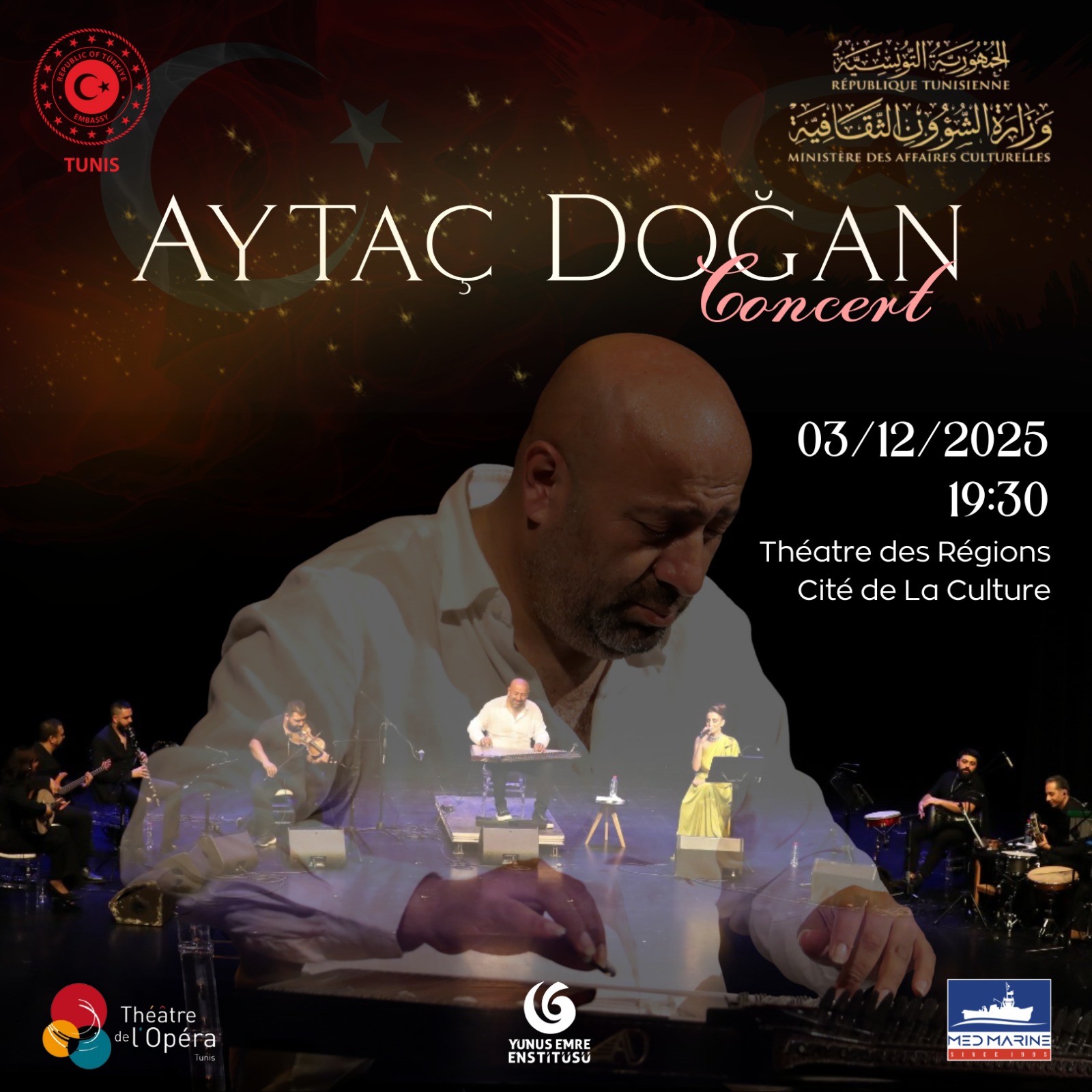 Le célèbre virtuose turc du kanun, Aytaç Doğan, donnera un concert certainement inoubliable le 3 décembre 2025 à la prestigieuse Cité de la Culture de Tunis. Ce concert est organisé sous le patronage de l'ambassade de la République de Türkiye à Tunis, avec le soutien de l'Institut Yunus Emre de Tunis et le parrainage de Med Marine.