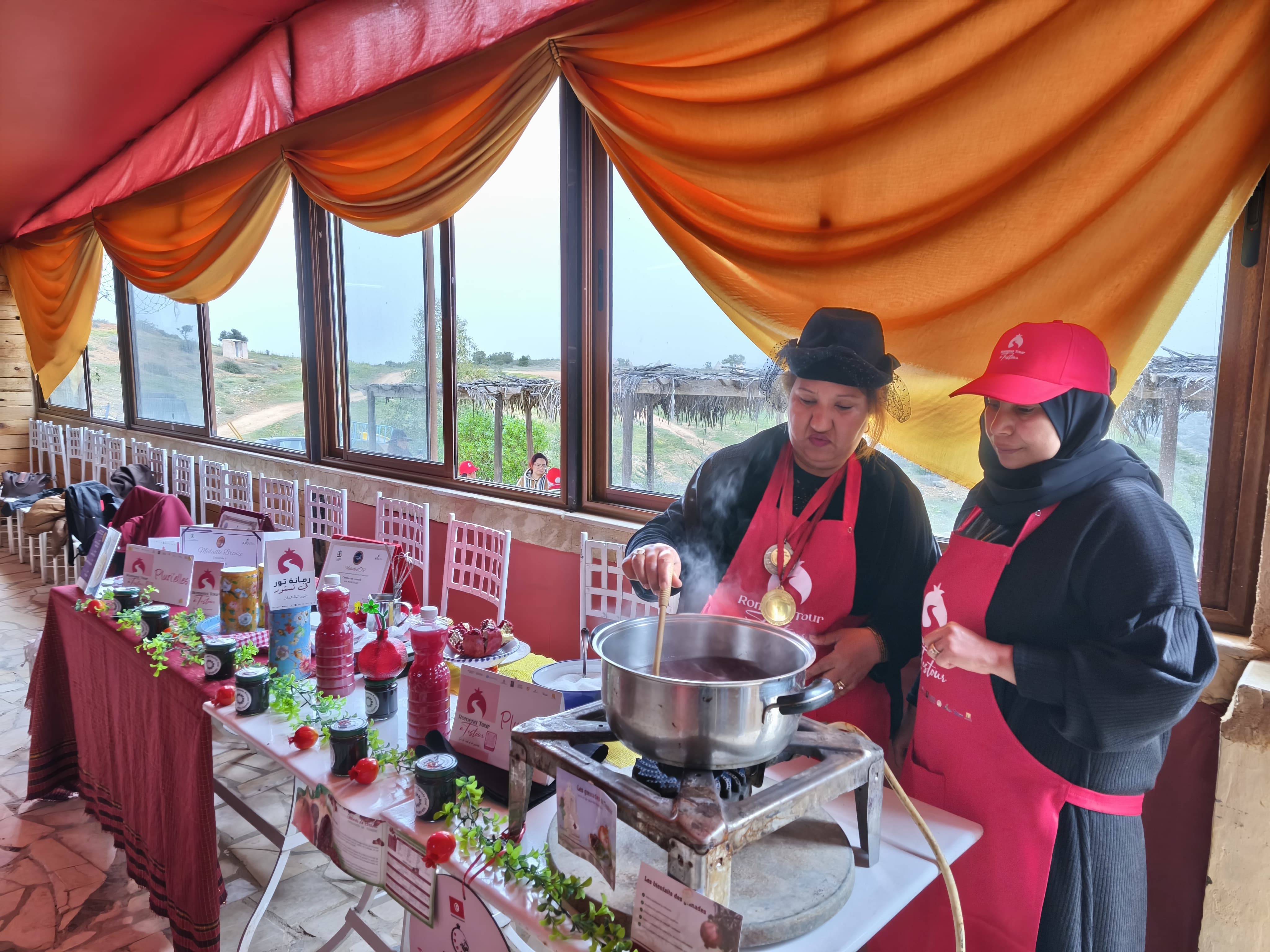 Le parcours s’est poursuivi avec des ateliers de transformation et de valorisation de la grenade, conçus comme de véritables moments de transmission et d’échange. L’atelier de préparation de jus de grenade « Jollanar » a permis de découvrir les méthodes de pressage et de valorisation du fruit frais, tandis que l’atelier de préparation de la gelée de grenade organisé par le groupement de femmes « Pluri’Elles » a mis en lumière les techniques artisanales de transformation en produits dérivés à forte valeur ajoutée. L’atelier culinaire de la « Rechta Hlowa », animé par Bit Lmouna un deuxième groupement de femmes, a offert une immersion dans le patrimoine gastronomique de Testour à travers une pâtisserie traditionnelle emblématique, révélant le lien étroit entre cuisine, mémoire collective et identité locale.