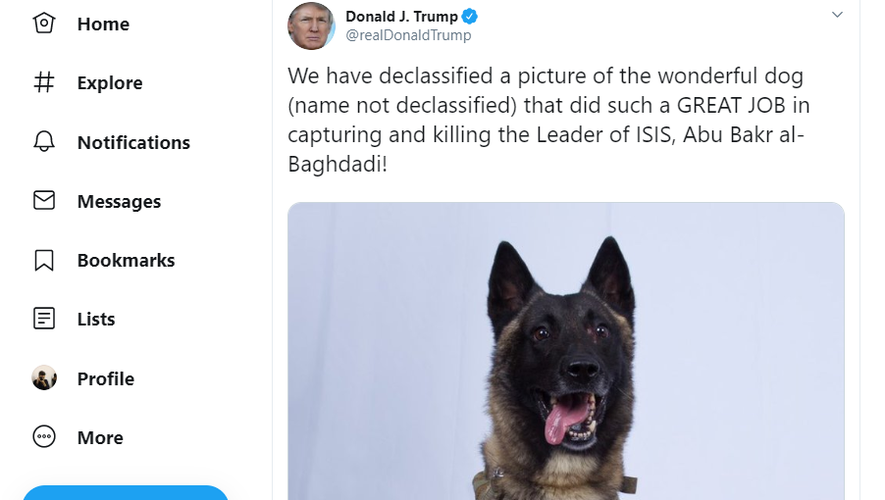 Sur Twitter, Donald Trump a néanmoins partagé la photographie déclassifiée de l'animal, indiquant qu'il avait fait "un travail génial dans la capture et la mort du leader de Daesh".