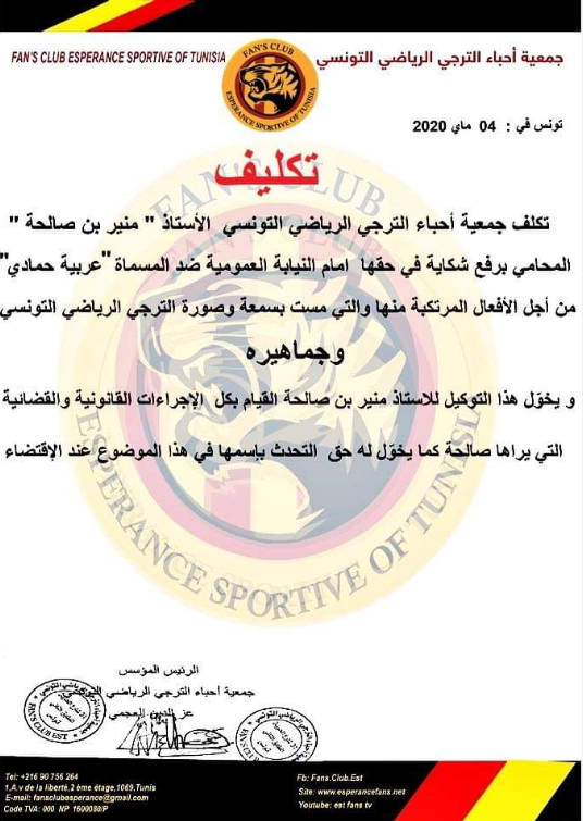 Le comité directeur du Fan’s Club de l’Espérance Sportive de Tunis a décidé de porter plainte contre l’animatrice controversée Arbia Hamadi considérant que cette dernière 's’est acharnée gratuitement sur le public d’une illustre équipe sportive ayant contribué activement à la libération du pays de la colonisation et hissé le drapeau national à l’échelle régionale, continentale et internationale '.