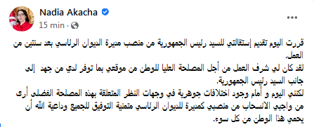 Dans un post paru ce soir sur sa page officielle, Facebook, Akacha annonce 'avoir décidé de présenter, aujourd’hui, sa démission au président de la république, après deux ans ' de sa prise de fonctions à ce poste.