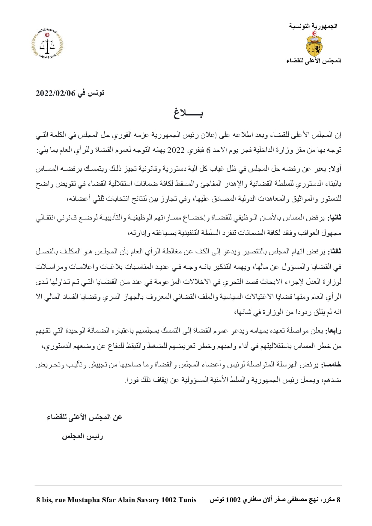 Le Conseil supérieur de la magistrature a annoncé qu’il poursuivait ses missions, appelant les magistrats « à s’attacher à leur conseil, étant la seule garantie qui les préserve du danger d’atteinte à leur indépendance dans l’accomplissement de leur devoir, du risque des pressions, et à être vigilants pour défendre leur situation constitutionnelle '.