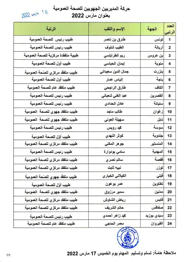 Le ministre de la Santé, Ali Mrabet, décide un mouvement partiel dans le corps des directeurs régionaux de la Santé, au titre de Mars 2022.