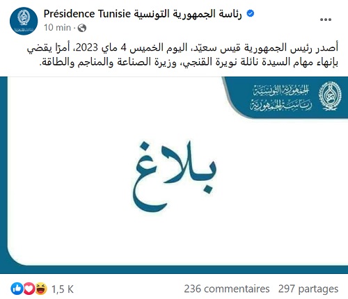 أصدر رئيس الجمهورية قيس سعيّد، أمس الخميس 4 ماي 2023، أمرًا يقضي بإنهاء مهام السيدة نائلة نويرة القنجي، وزيرة الصناعة والمناجم والطاقة.