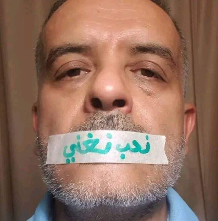 ونشر الجبالي صورة له على صفحته الرسمية على موقع الفيسبوك ظهر فيها وهو يضع على فمه شريطا لاصقا كتب عليه عبارة ''نحب نغني'' .
