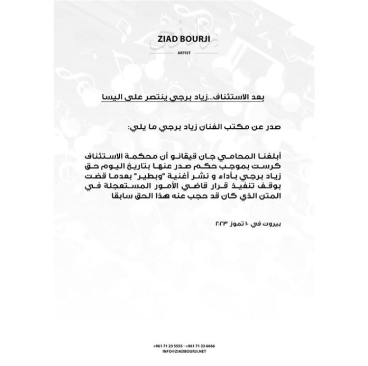 ونشر المكتب الإعلامي للفنان زياد برجي بيانا جاء فيه: "أبلغنا المحامي جان قيقانو أن محكمة الاستئناف كرست بموجب حكم صدر عنها بتاريخ اليوم حق زياد برجي بأداء ونشر أغنية وبطير، بعدما قضت بوقف قرار قاضي الأمور المستعجلة في المتن الذي كان قد حجب عنه هذا الحق سابقاً".