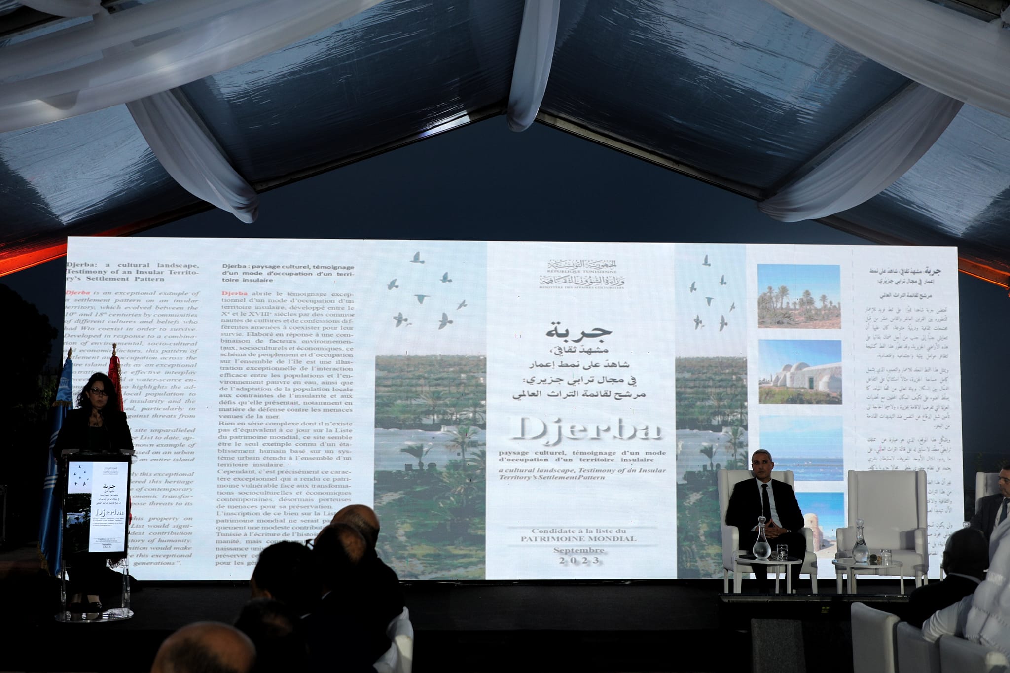 وألقت الوزيرة كلمة تحدّثت فيها عن ملف ترشيح الممتلك الثقافي جربة: شاهد على نمط إعمار في مجال ترابي جزيري'' لإدراجه في لائحة التراث العالمي، كانت تقدّمت به تونس سنة 2021.