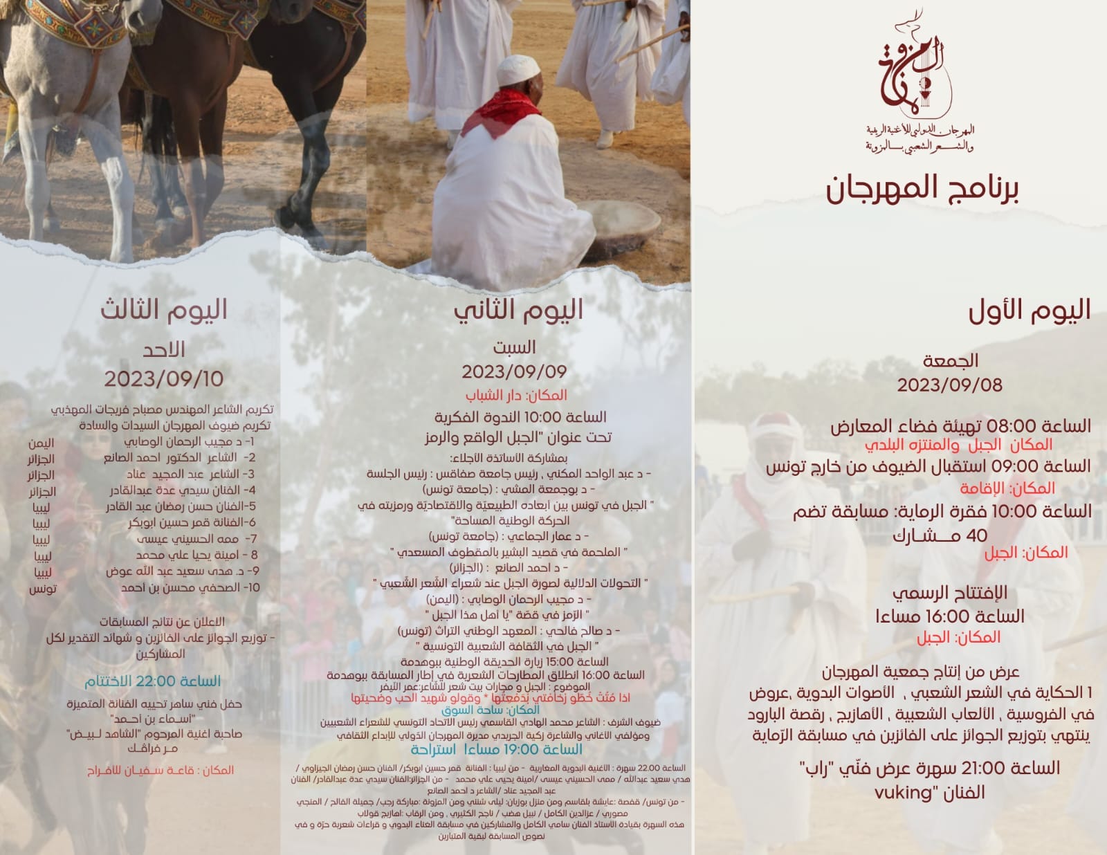 وتختتم فعاليات الدورة، يوم 10 سبتمبر، بتكريم الشعراء المشاركين في الدورة والاعلان عن مختلف نتائج المسابقات وحفل فني للفنانة أسماء بن احمد.