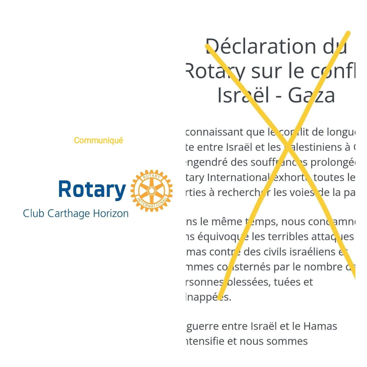أعلن أعضاء نادي روتاري قرطاج الأفق،رفضهم القاطع لبيان روتاري الدولية حول القضية الفلسطينية ويعلنون انسحابهم من المنظمة.