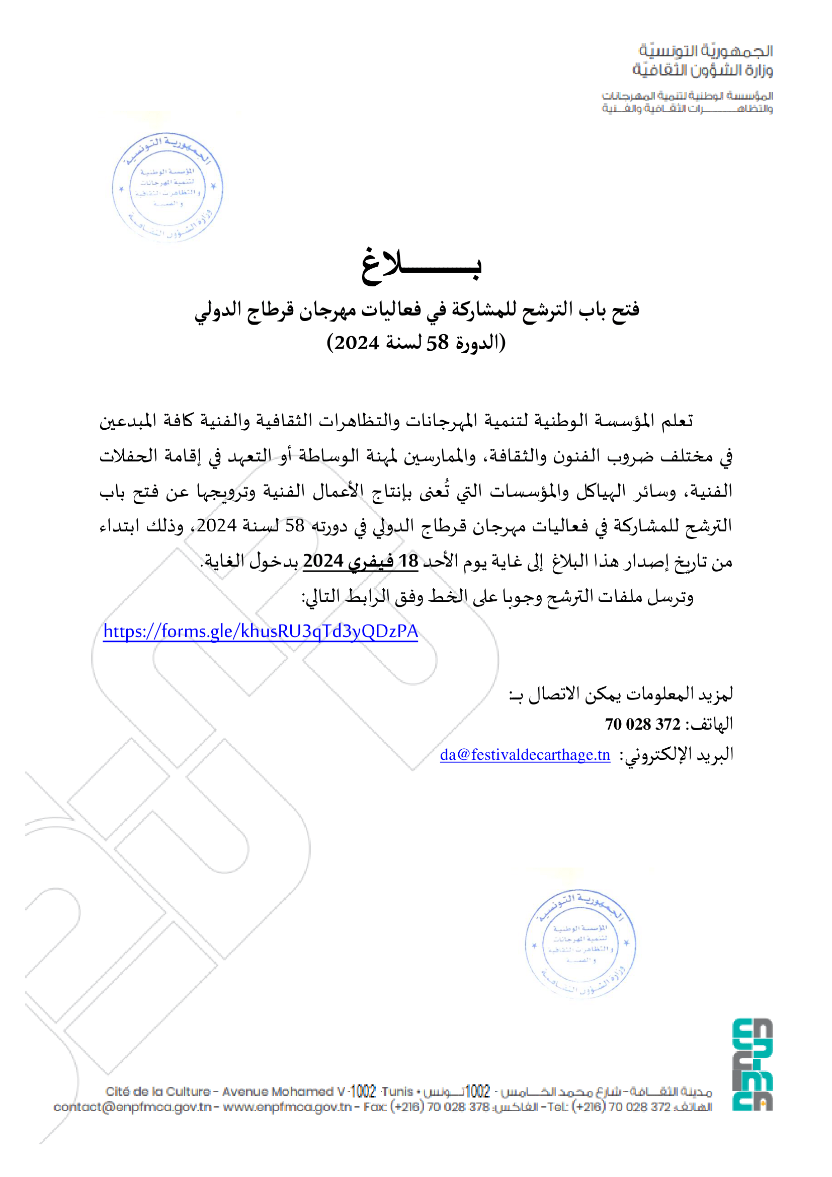 أعلنت المؤسسة الوطنية لتنمية المهرجانات والتظاهرات الثقافية والفنية كافة المبدعين في مختلف ضروب الفنون والثقافة، والممارسين لمهنة الوساطة أو التعهد في إقامة الحفلات الفنية، وسائر الهياكل والمؤسسات التي تُعنى بإنتاج الأعمال الفنية وترويجها عن فتح باب الترشح للمشاركة في فعاليات مهرجان قرطاج الدولي في دورته 58 لسنة 2024، وذلك ابتداء من تاريخ إصدار هذا البلاغ إلى غاية يوم الأحد 18 فيفري 2024 بدخول الغاية.