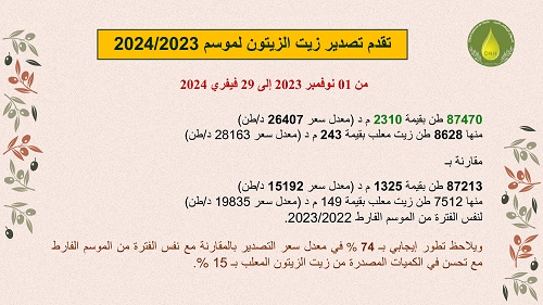 ارتفعت عائدات تصدير زيت الزيتون التونسي، بفضل ارتفاع معدل سعر التصدير، خلال الموسم الحالي 2023/2024، بنسبة 74%، مقارنةً بالموسم الفارط 2022/2023، وذلك خلال الفترة من 1 نوفمبر 2023 إلى 29 فيفري 2024، وفق معطيات أوردها الديوان الوطني للزيت.