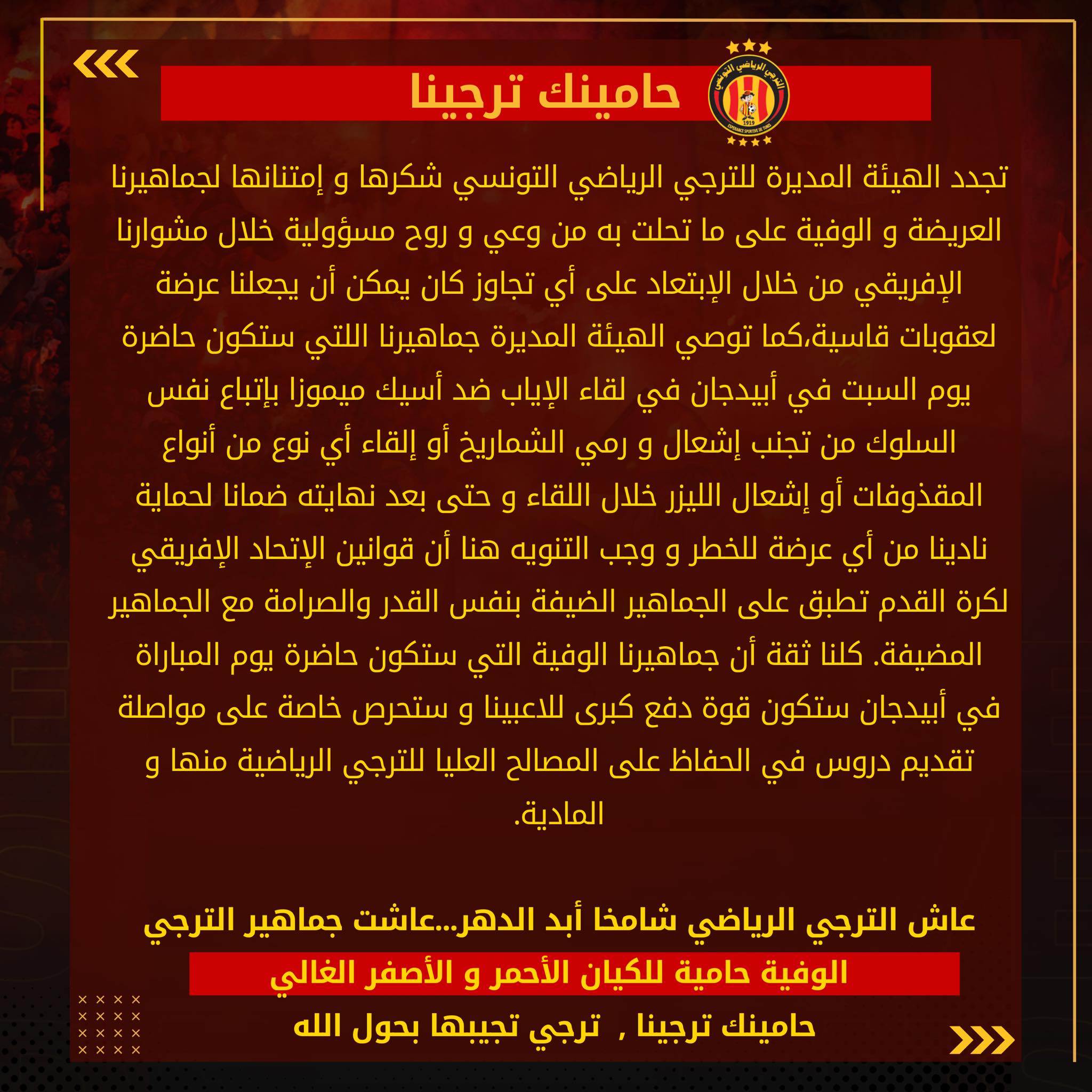 دعا الترجي الرياضي في بلاغ عبر صفحته الرسمية ، ليلة أمس الاثنين 1 أفريل 2024، جماهيره التي ستكون متواجدة في أبيدجان إلى تجنب اشعال الشماريخ ورمي المقذوفات تجنبا لعقوبات الاتحاد الإفريقي لكرة القدم.