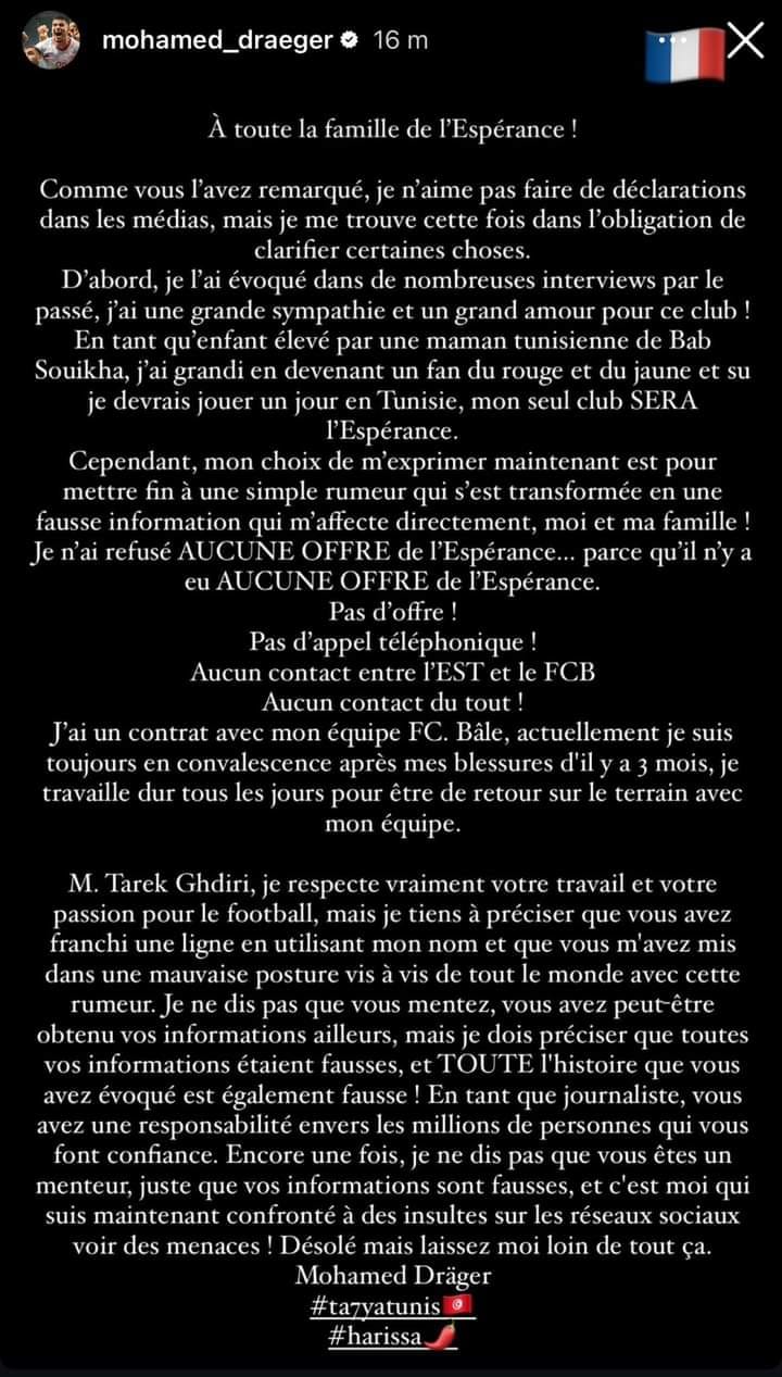 ونشر دراغر تدوينة على إنستغرام مساؤ الثلاثاء قال فيها إنه تربى على حب الترجي الرياضي لكن ليس هناك أي اتصال سواء معه أو مع فريقه بازل السويسري.