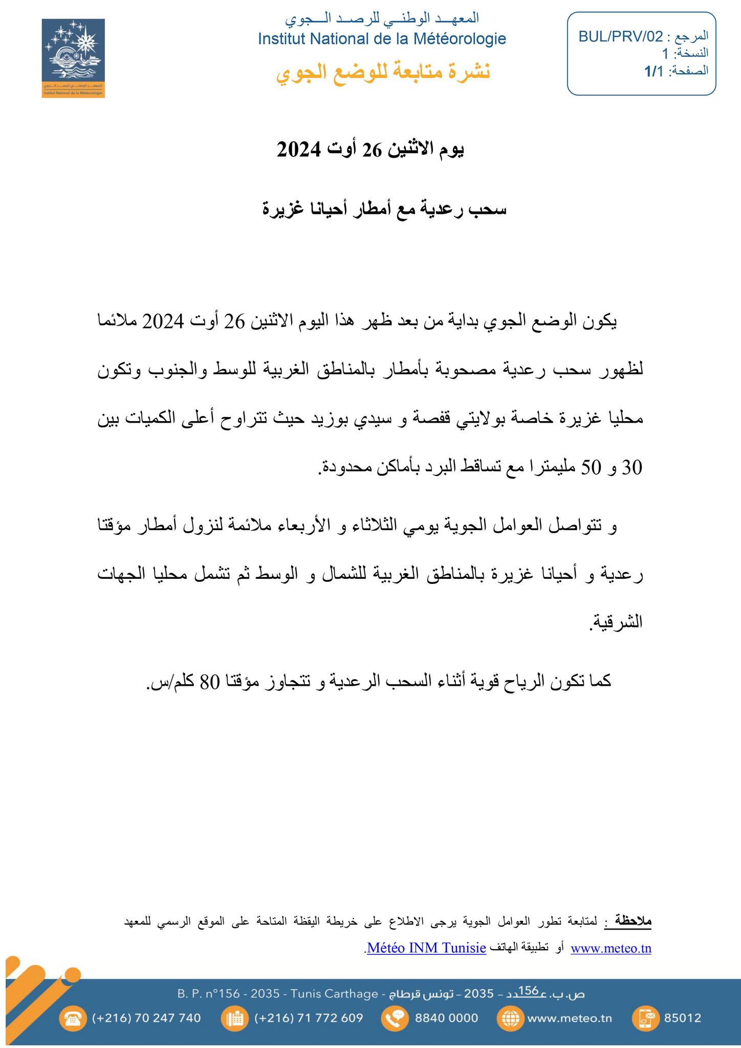 يكون الوضع الجوي، بداية من بعد ظهر الاثنين، ملائما لظهور سحب رعدية مصحوبة بامطار بالمناطق الغربية للوسط والجنوب، وتكون محليا غزيرة خاصة بولايتي قفصة وسيدي بوزيد حيث تتراوح اعلى الكميات بين 30و 50 ميلمترا مع تساقط البرد باماكن محدودة.