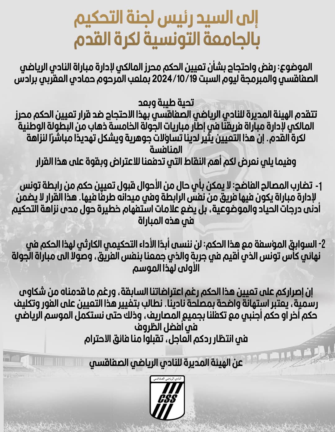 تقدم النادي الصفاقسي، باحتجاج رسمي، على طاقم التحكيم المكلف بإدارة مباراته المقبلة أمام النادي الإفريقي، في خامس جولات من الرابطة المحترفة الأولى لكرة القدم .