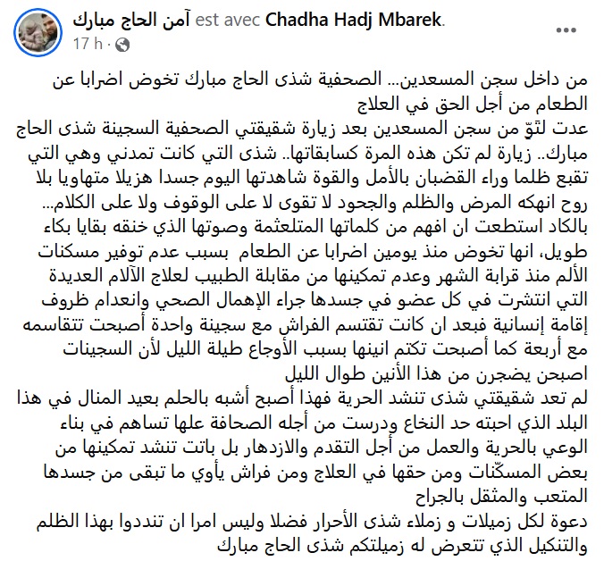 و كشف المتحدث، أنّ شقييته "شذى الحاج مبارك، كانت تقتسم الفراش مع سجينة واحدة، فأصبحت تتقاسمه مع أربع، كما أصبحت تكتم أنينها بسبب الأوجاع طيلة الليل لأن السجينات أصبحن يضجرن من أنينها طوال الليل"، داعيا إلى "التنديد بهذا الظلم والتنكيل الذي تتعرض له شقيقته"، وقال: "لم تعد شذى تنشد الحرية فهذا أصبح أشبه بالحلم بعيد المنال.. بل باتت تنشد تمكينها من بعض المسكّنات ومن حقها في العلاج ومن فراش يأوي ما تبقى من جسدها.."وفق قوله.