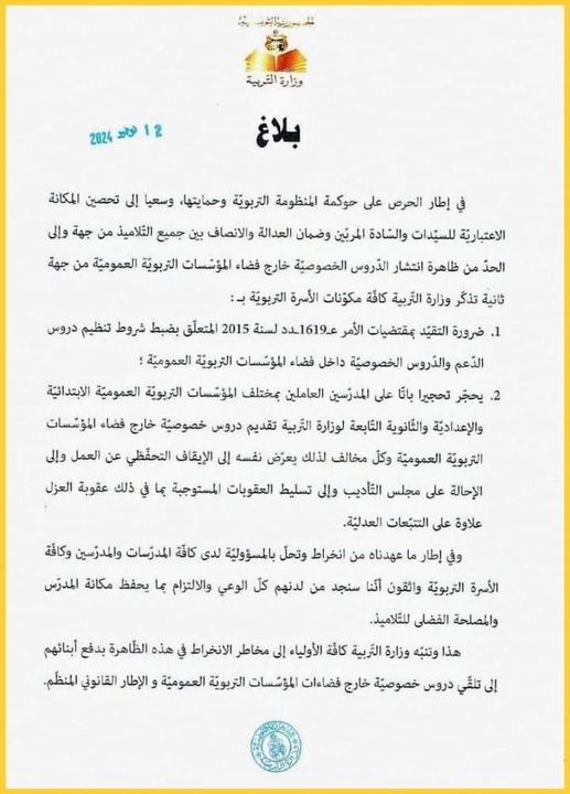 أعلنت وزارة التربية، اليوم الثلاثاء12 نوفمبر 2024، عن تحجير تقديم الدروس الخصوصية خارج فضاءات المؤسسات التربوية العمومية.