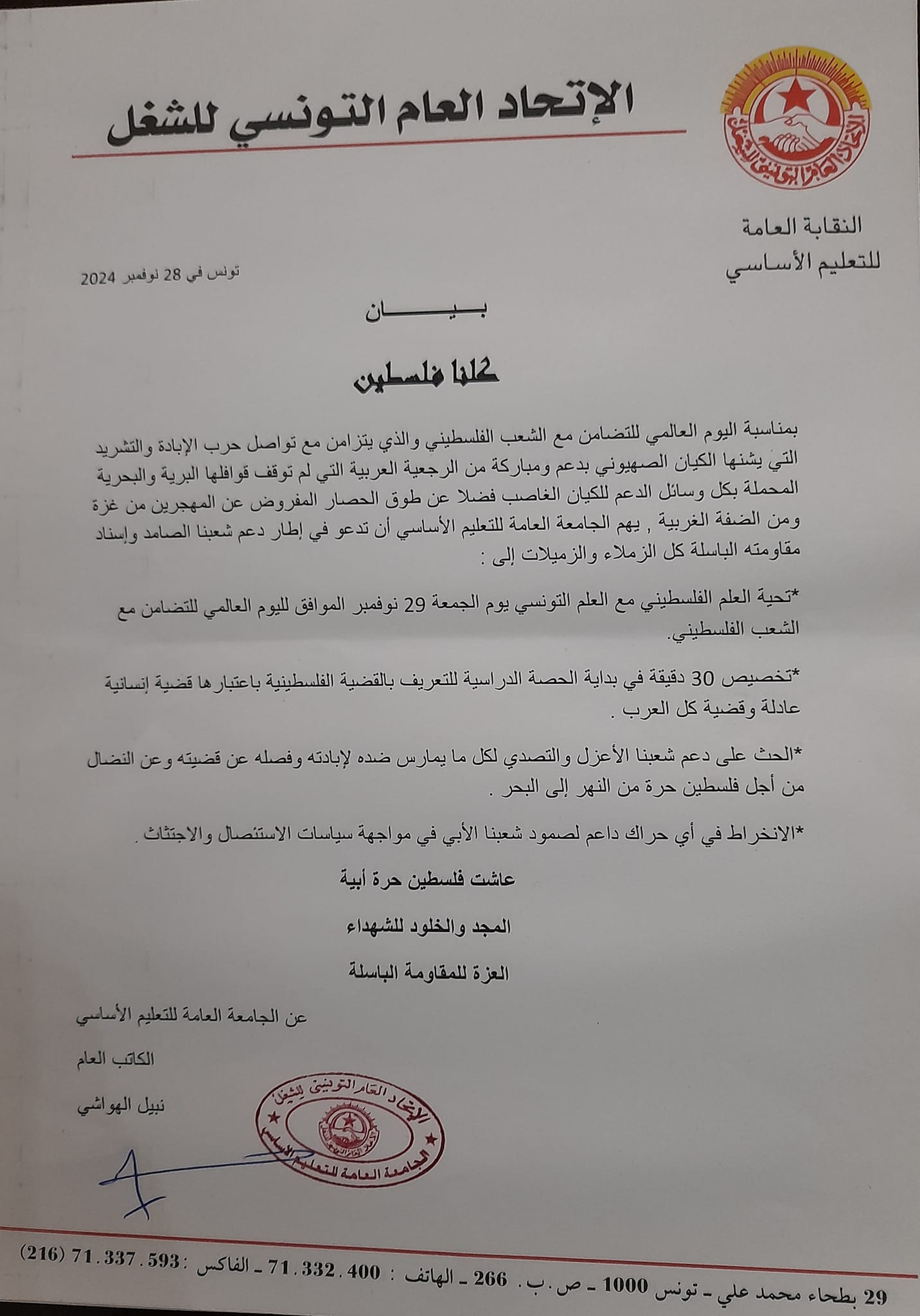 دعت جامعة التعليم الأساسي، كل منظوريها إلى تحية العلم الفلسطيني مع العلم التونسي، غدا الجمعة 29 نوفمبر 2024، الموافق لليوم العالمي للتضامن مع الشعب الفلسطيني.