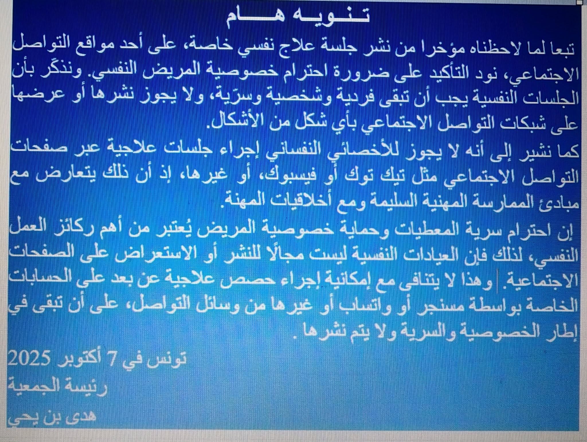 دعت الجمعية التونسية لعلم النفس، اليوم الأربعاء 8 أكتوبر 2025، إلى الالتزام الصارم بمبدأ سرية المعطيات الخاصة بالمرضى، مؤكدة أن احترام السرية يمثل إحدى الركائز الجوهرية للعمل النفسي وأساس الثقة بين الأخصائي والمريض.