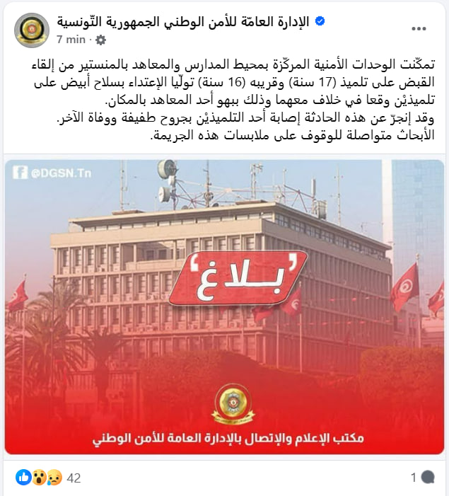 أعلنت الإدارة العامة للأمن الوطني بالجمهورية التونسية، مساء أمس الاثنين 9 فيفري 2026، أنّ الوحدات الأمنية المركّزة بمحيط المدارس والمعاهد بالمنستير، تمكّنت من إلقاء القبض على تلميذ (17 سنة) وقريبه (16 سنة) تسببا في مقتل أحد التلاميذ.